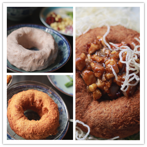 2. Make the yam dough into ring shape, put in onto bomboo rack, Deep-fry int he hot oil over high heat until golden brown and crispy. Remove from heat, drain well and ready to serve.